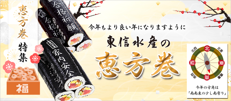 東信水産の祈願巻は、活きの良い魚介をふんだんに使っていて見た目もかなり豪勢です。中には本まぐろを使用した商品もあるから、節分という大切な行事を彩る料理に最適。家族や友だちとシェアするのもオススメです。
