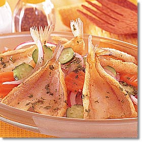 | 一般に出まわっているのはシロギスと呼ばれるもので、名前通り色が白いのが特徴。英名では「Japa-nese whiting」と呼ばれています。脂質が少なく淡泊な味で、江戸前の天ぷらには欠かせない日本の味です。開いて冷凍にしたものが多いので、水分をよく拭き取ってから調理しましょう。 |