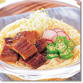 | 夏バテ防止によいとされているうなぎ。土用の丑の日にうなぎを食べる風習が定着したのは、なんと江戸時代中期からだそうです。それから今日に至るまで、季節を問わず、私たちには欠かせない魚となっています。うなぎの栄養価で注目されるのがビタミンA。うなぎの蒲焼1/2串、肝30gで1日の所要量を満たしてくれます。 |