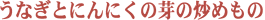 | うなぎとにんにくの芽の炒めもの | うなぎの混ぜごはん | 白焼のフライマスタード | 白焼サラダ仕立て | うなぎの洋風そうめん | ||||||
