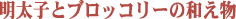 | 手作り辛子明太子 | たらこと長いもソースドリア | 生たらこの炊き合わせ | 明太子とブロッコリーの和え物 | 明太子とアボガドのワンタン包み揚げ | ||||||