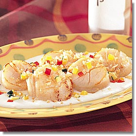 帆立貝は強火で手早く焼いて、おいしそうな焦げ目をつける。 |