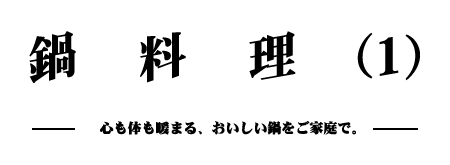 | 冬の一番のごちそうといえばやっぱり鍋です。素材も味つけも自由自在、それぞれ好みにアレンジできるところがうれしいものです。おいしく食べるポイントはだしです。昆布や酒を入れることで、ぐっと風味がよくなります。さて今夜はどの鍋にしましょうか?